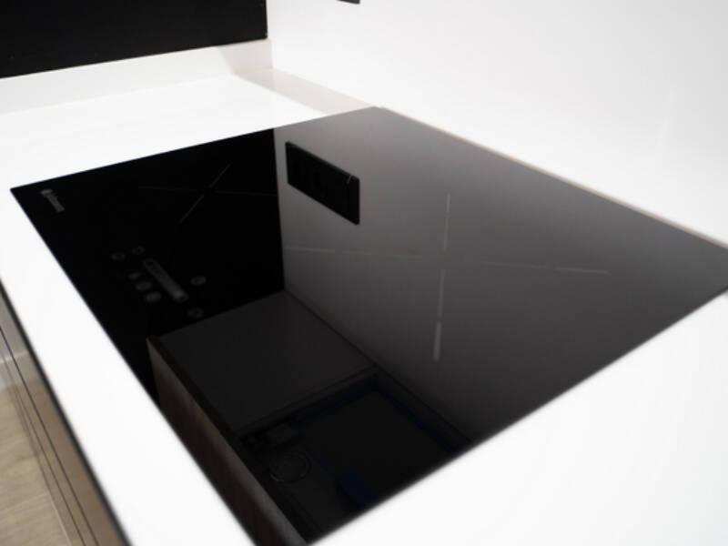 – Kitchen with upper and lower cabinets, synthetic quartz countertop, sink and Hood stainless